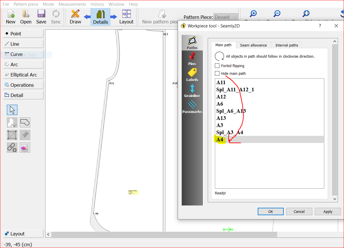 Then I looked at the ‘Dos’ pattern piece path. A13 was missing at the back neck, so I added it in. Your path ended on the curve, so I moved A4 from the top of the path to the end. Then I re-tried the seam allowance change for Before A4 worked! Here is your file: