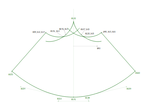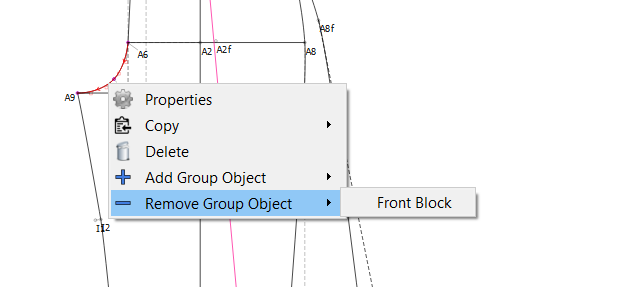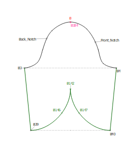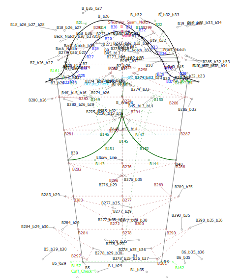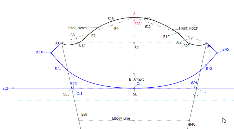 Here, you can see that I have my Basic sleeve in a group. This sleeve fits into the armhole of my bodice. If I want to print a pattern with this basic sleeve, all I have to do is to open the Eye on the group and I can select all the points without any distractions from other construction points. I can see the outlines very easily.