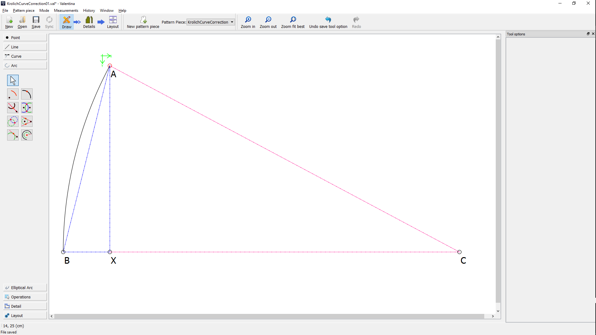 It works VERY well, but, considering what a right royal pain it was to figure out and then put the formula together, I propose a tool is added to create an arc from A to B with the center along the line that includes X. (i.e. ‘Pick three points.’)