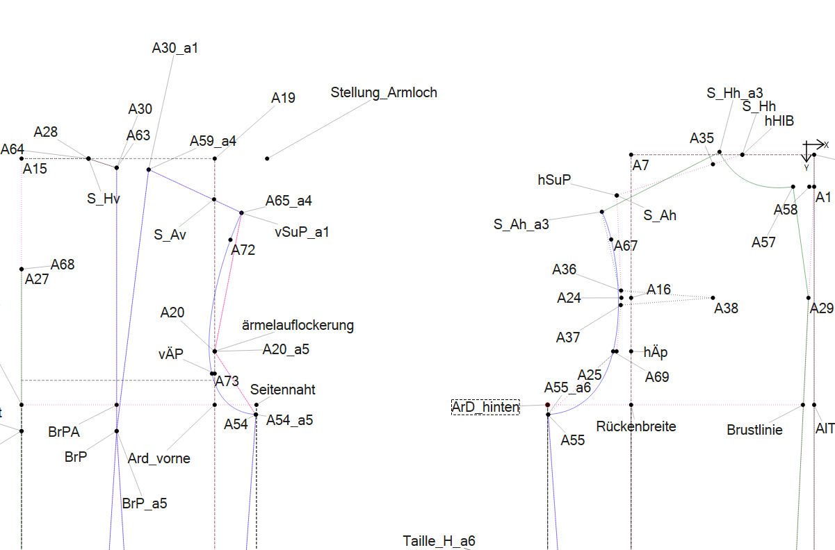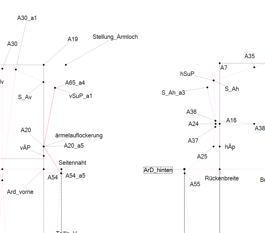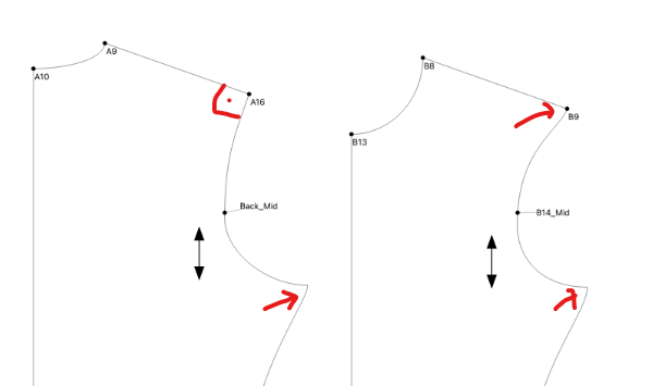 Der Punkt B9 und A16 kommen aufeinander. Diese Stelle wird meiner Meinung nach nicht gut aussehen. Wenn du dir diesen Punkt am Menschen anschaust, wirst du feststellen, auch wenn der Ärmel eng sein soll, dass die Linien relativ senkrecht am Vorderteil sowie am Rückenteil nach unten gehen und man an dieser Stelle mit einem rechten Winkel zur Schulternaht arbeiten sollte. Genau das gleiche gilt für den Pinkt am Armloch/Seitennaht.