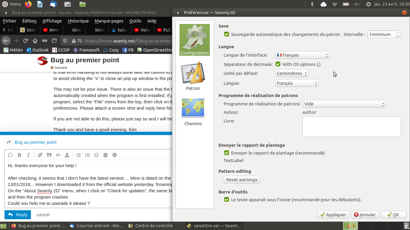 Ce n’est peut-être pas votre problème. Il existe également un problème selon lequel la structure complète du répertoire ou du dossier n’est pas créée automatiquement lors de la première installation du programme. Si possible, veuillez démarrer le programme Seamly2D, sélectionnez le menu ‘Fichier’ en haut, puis cliquez sur la troisième icône à gauche pour afficher les préférences. Veuillez joindre une capture d’écran et répondre ici pour plus d’assistance.