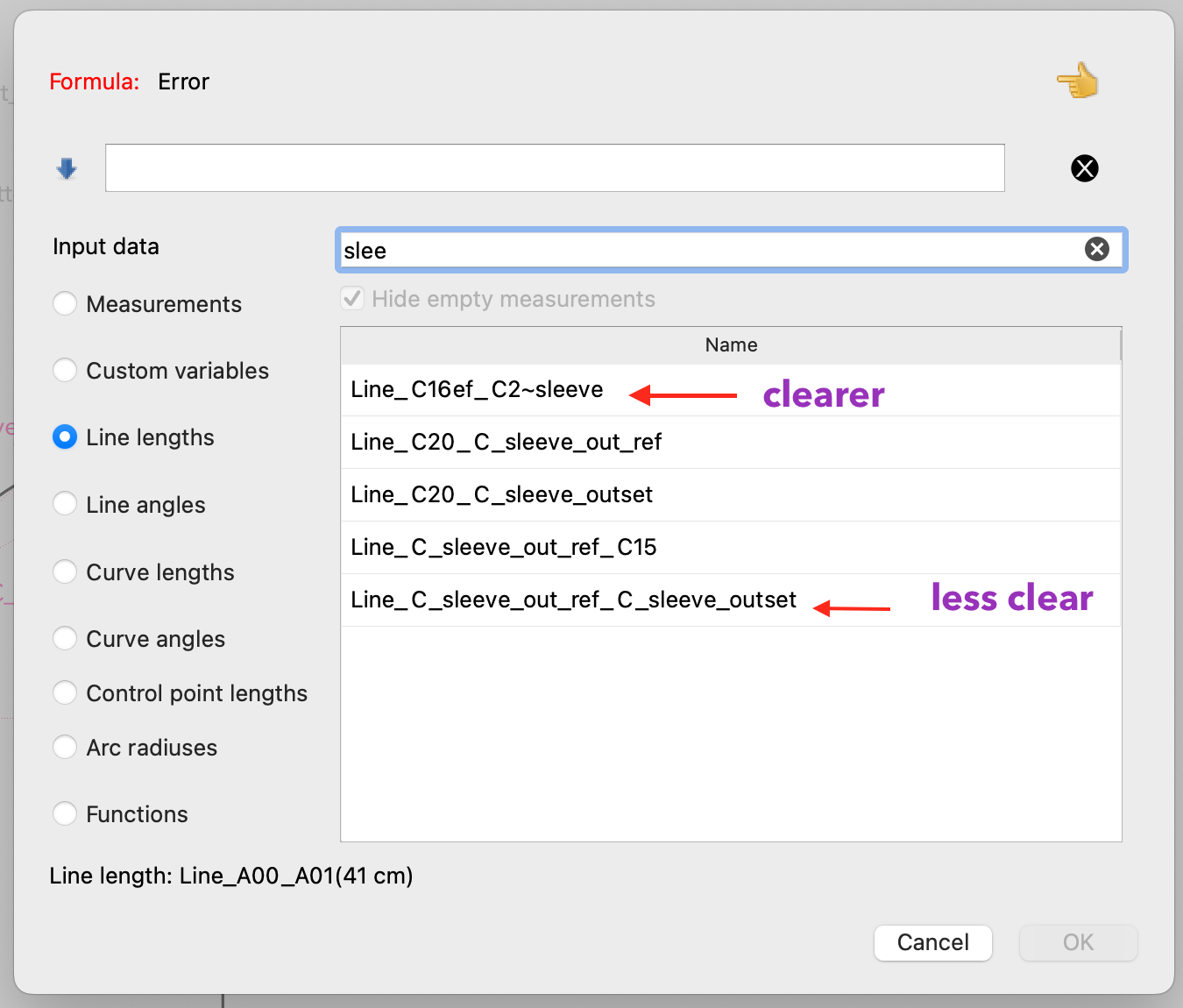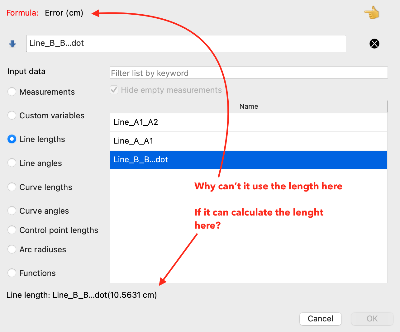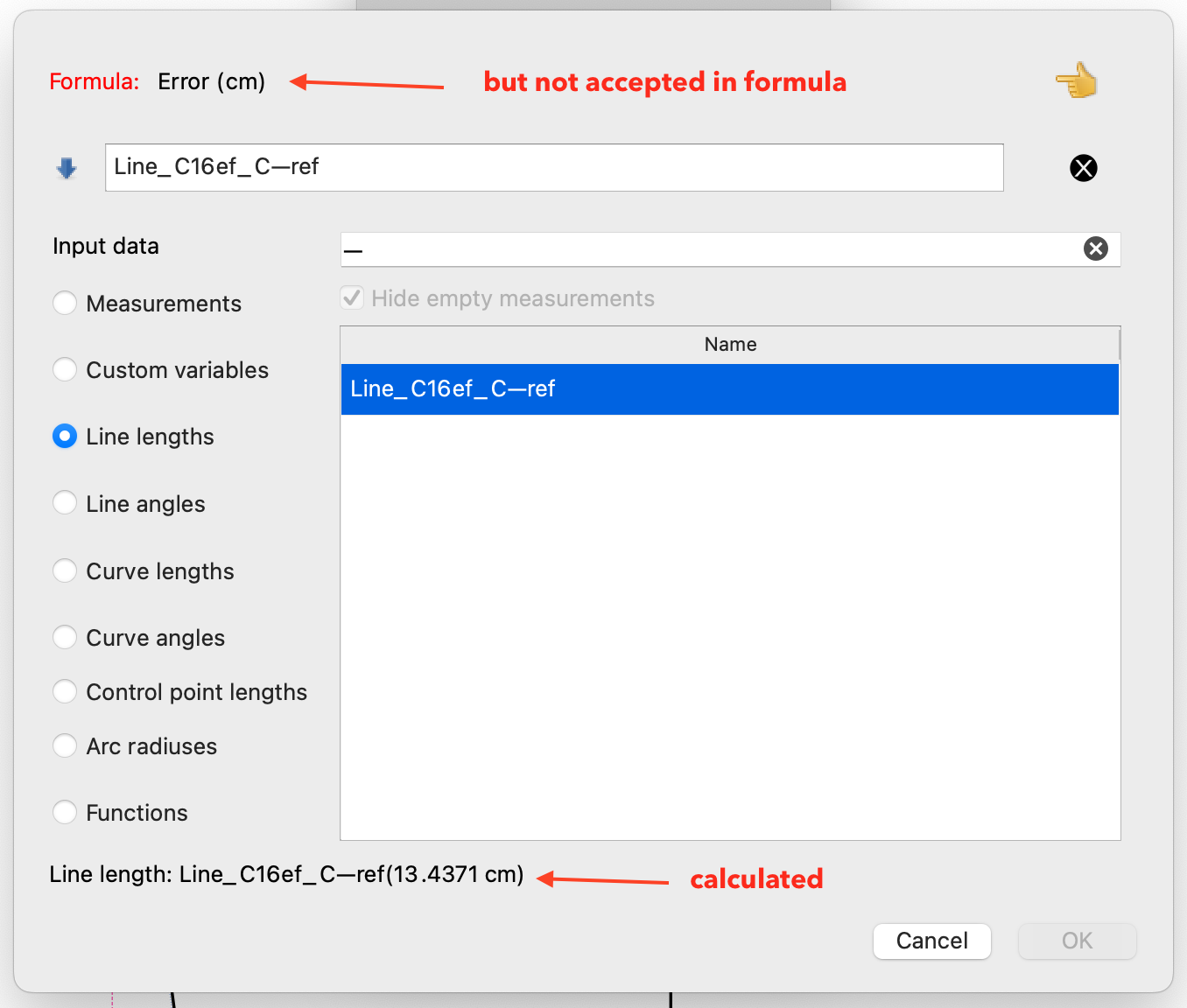 but when using characters not accepted by the math parser Seamly is still capable of calculating the lenght of the line, even if one of two points has “illegal” characters in the name.