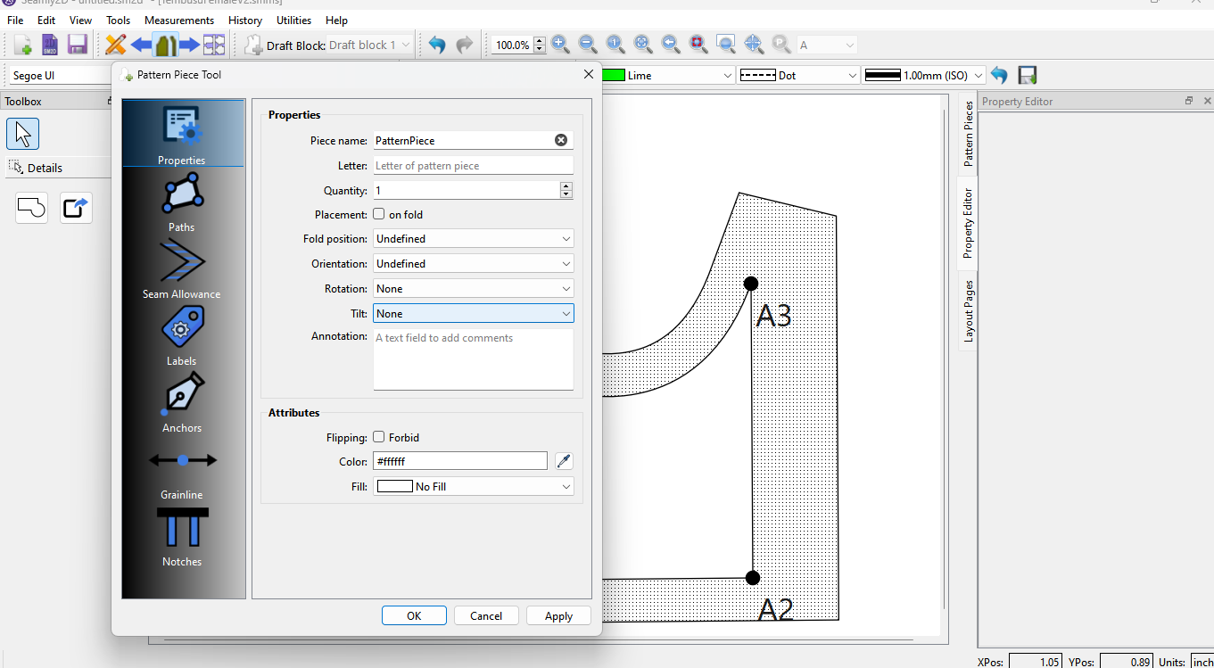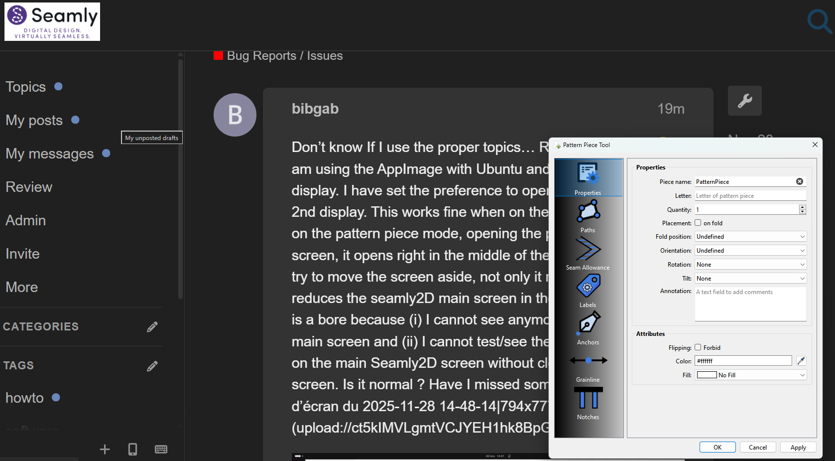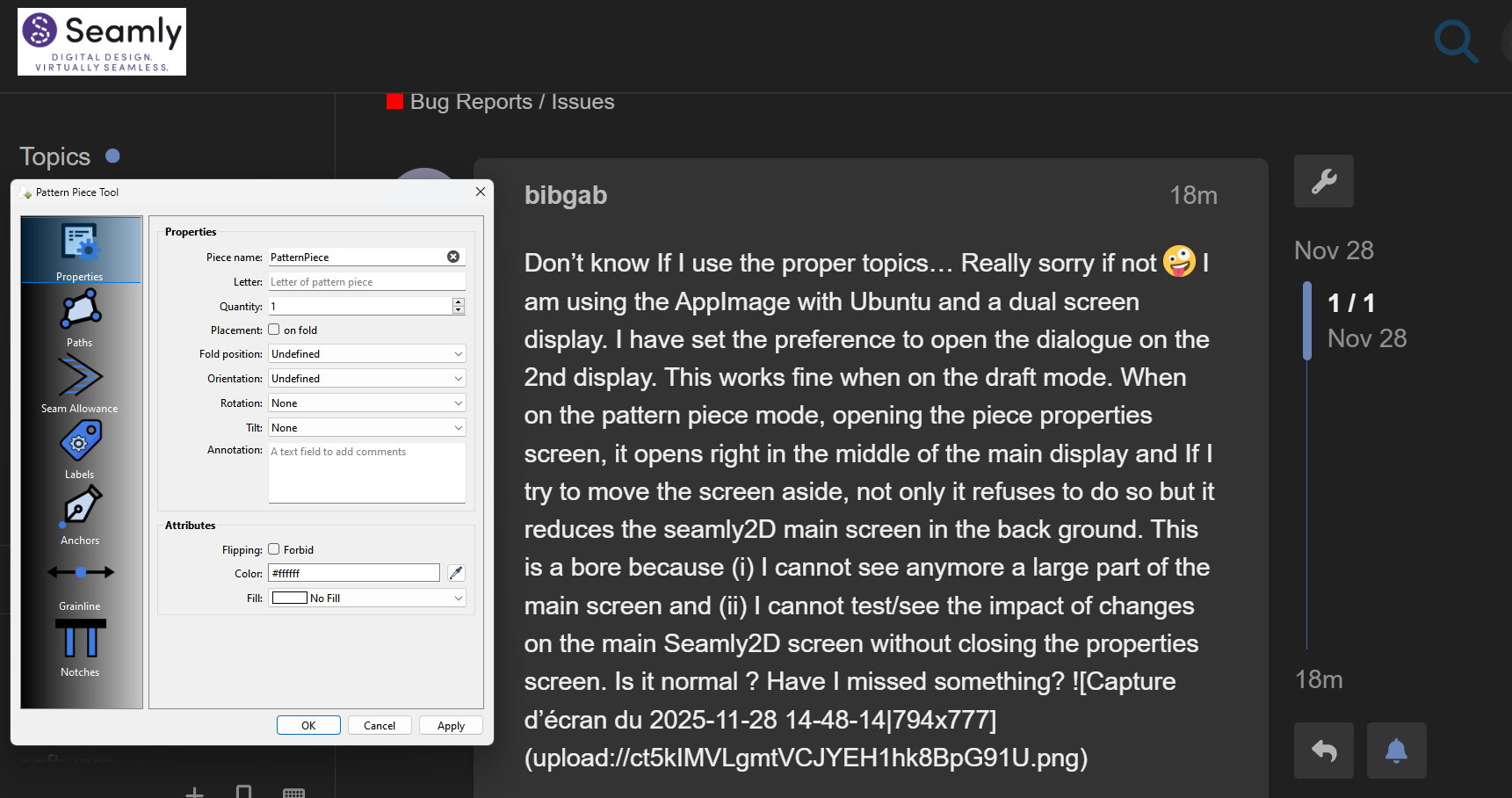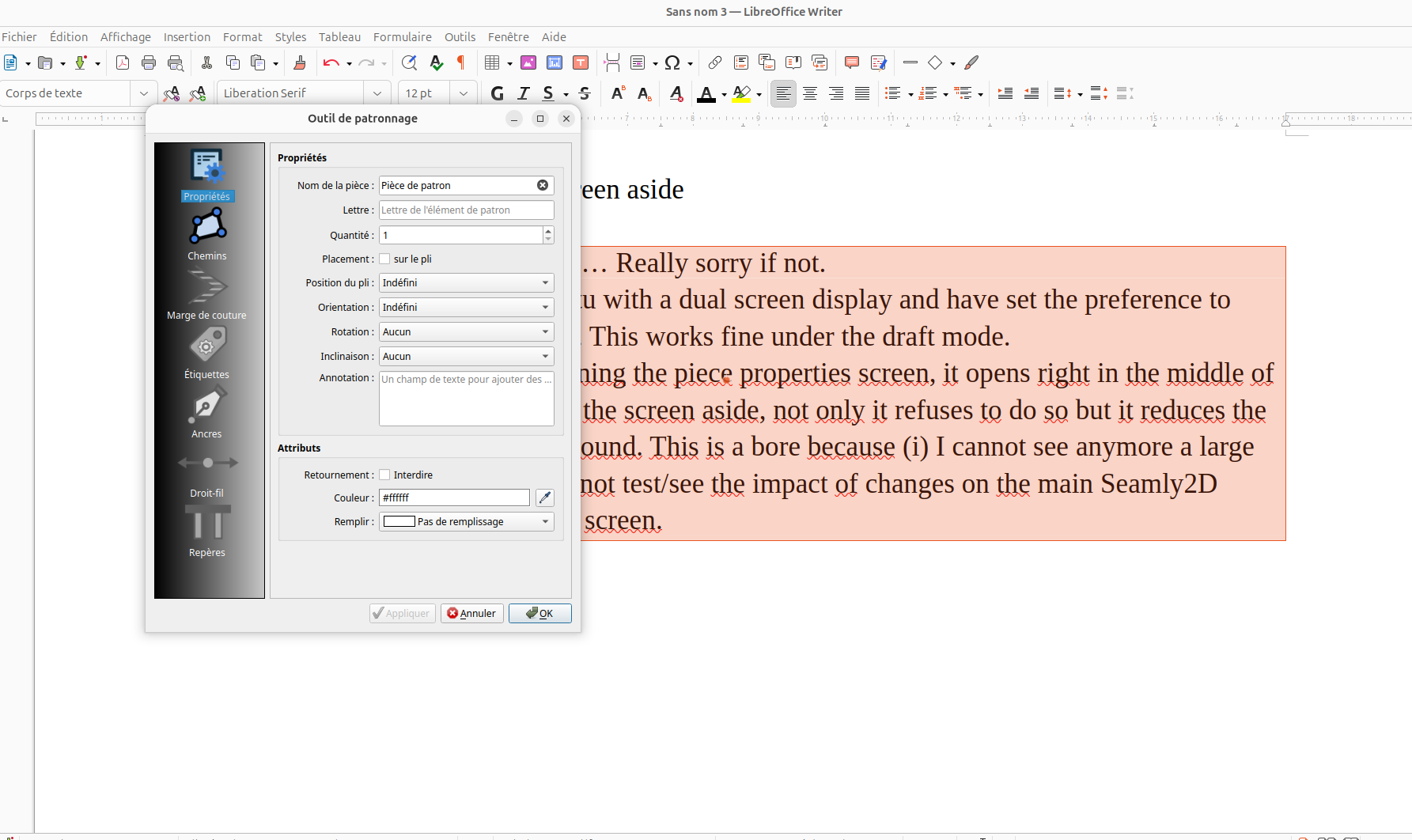 When on the pattern piece mode, opening the piece properties screen, it opens right in the middle of the main display and If I try to move the screen aside, not only it refuses to do so but it reduces the seamly2D main screen in the back ground. This is a bore because (i) I cannot see anymore a large part of the main screen and (ii) I cannot test/see the impact of changes on the main Seamly2D screen without closing the properties screen.