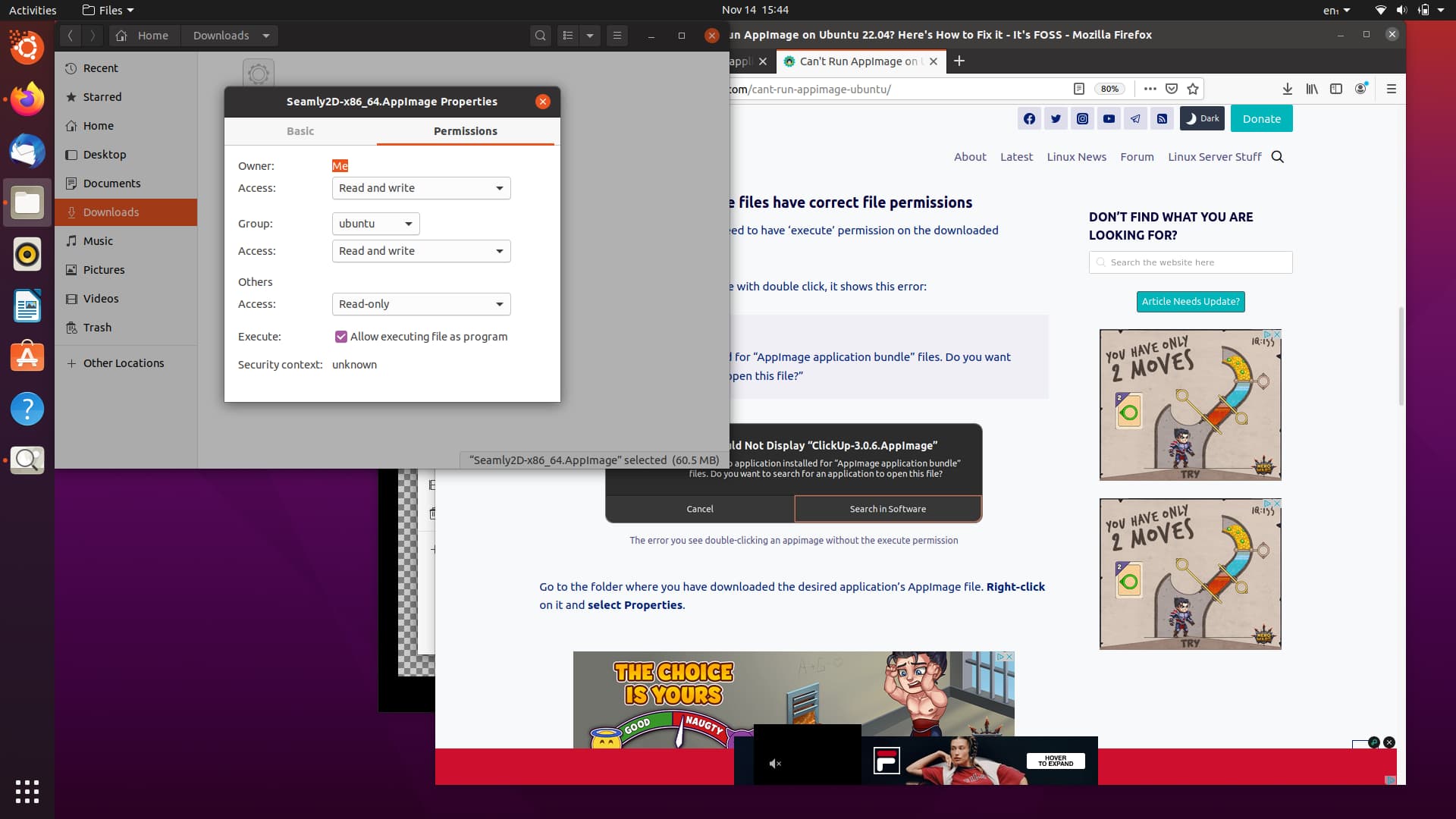 1. After you download the file, you will need to right-click on the .appimage file, and set permissions to ‘Execute’.