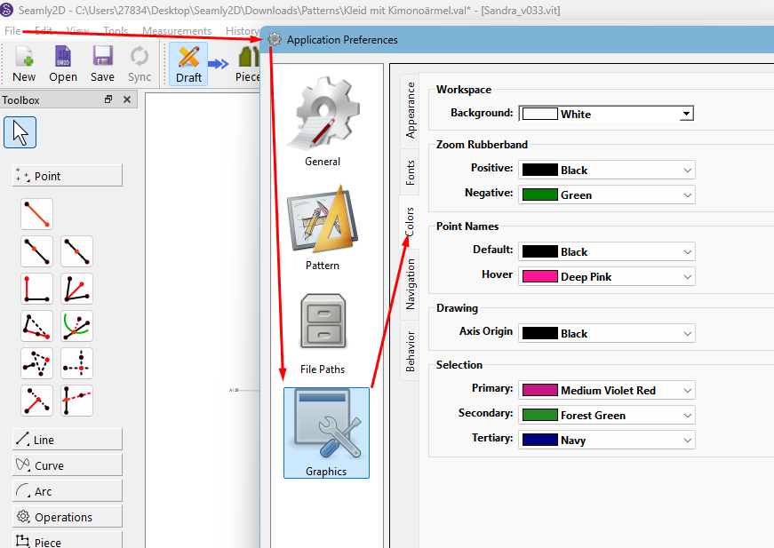 I suggest that you open Seamly and, before you load any patterns, go to File > Application Preferences > Graphics > Color and select the default colors that you would like to use. Here is a screenshot of the colors that I have set: