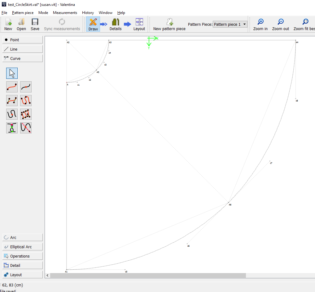 This circle skirt has a larger initial waist circumference, which results in a larger circumference for abdomen and hips. This is a good approach for someone who is an XXXL, with a large upper abdomen and large hips. The enlarged waist must be taken in with darts.