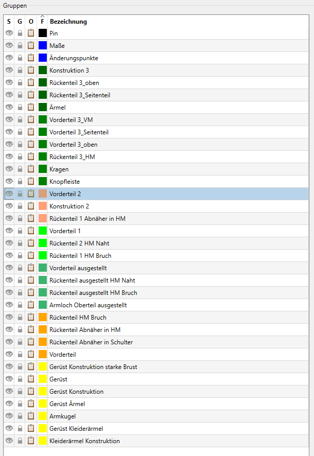 Diese Grundschnitte nehme ich dann für die Modelentwicklung. Wenn ich dann dieses Model verändern möchte, nehme ich im Gruppen Manager die Gruppen zur Hilfe. Um alles auseinander halten zu können, ordne ich den einzelnen Gruppen Farben zu, damit ich immer weiß an welcher Weiterentwicklung ich arbeite.