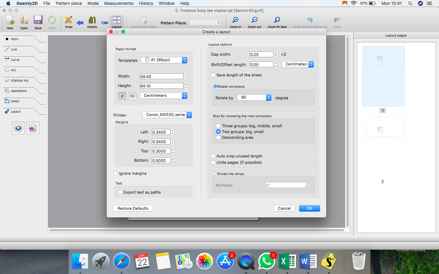 With that being said… I know from experience that it can be trial and error to pick a layout paper size and get it to tile the least number of pages. I also know from 40+ years experience I could layout the pieces manually faster than the trial and error process takes. That’s why I forsee the layout section being replaced / outdated by a true marker module, where you would pick your fabric width and either place pieces manually or have the app do it automatically.