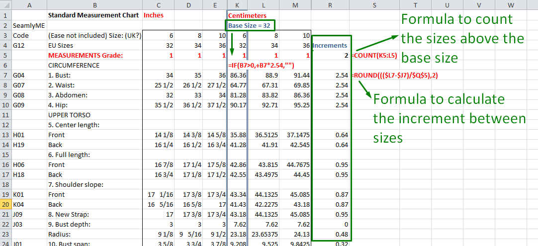Once I have everything set up according to the book, I then add SeamlyME codes, convert the measurements to centimeters and work out the increments.