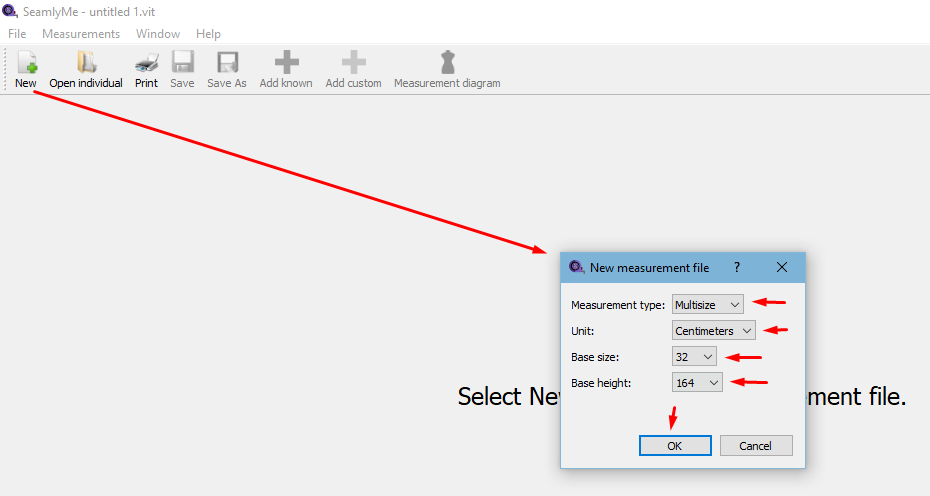 You may now create your measurement file in SeamlyME. Open SeamlyME, select New, Multisize, Centimeters, Base size 32 & I’m quite short, so I enter 164cm for base height. Click on OK & you can start keying in your values.