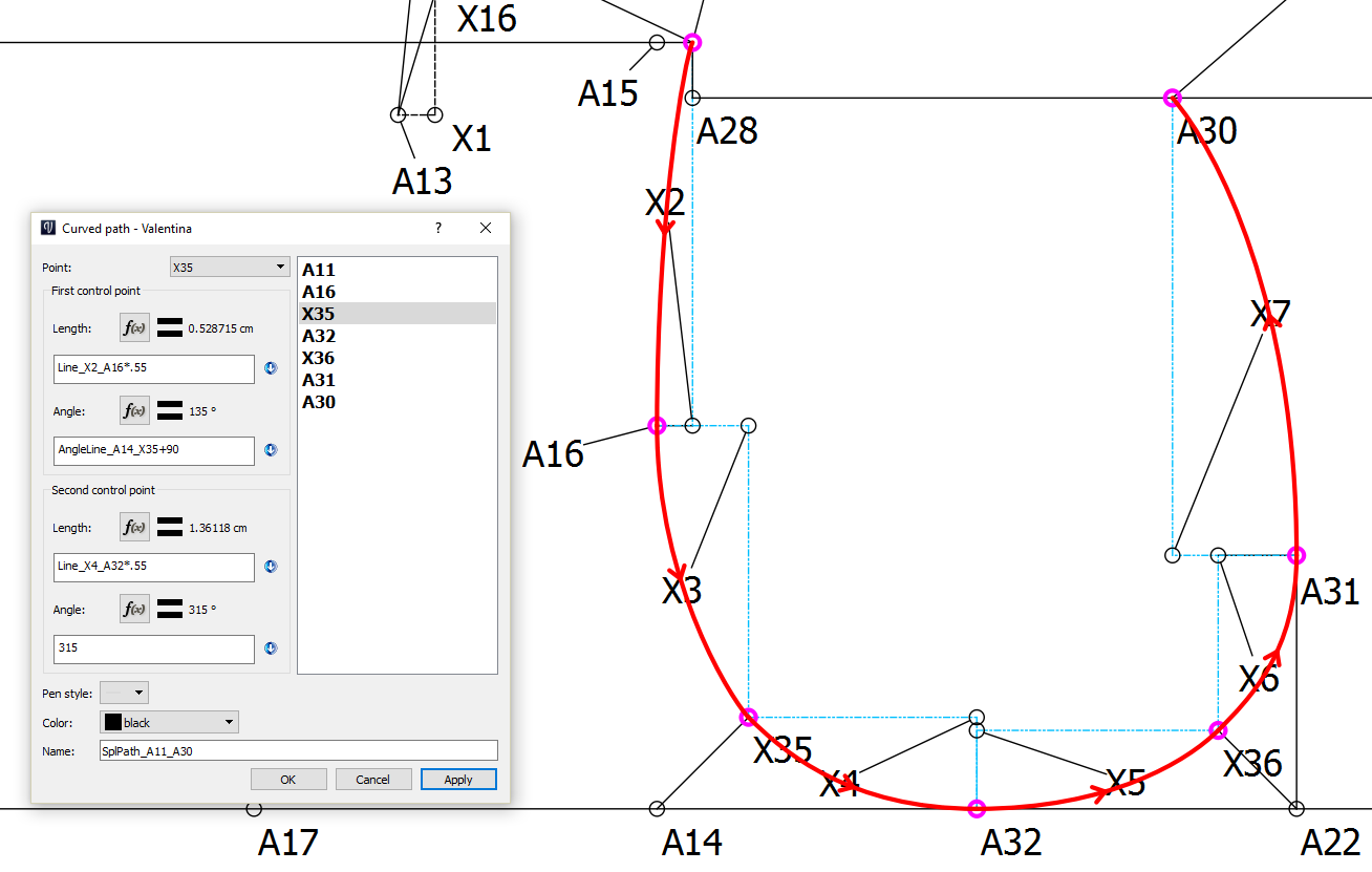 For the length of the second control point, do the same thing, but with the next reference and curve points. (X4 and A32 in the example).