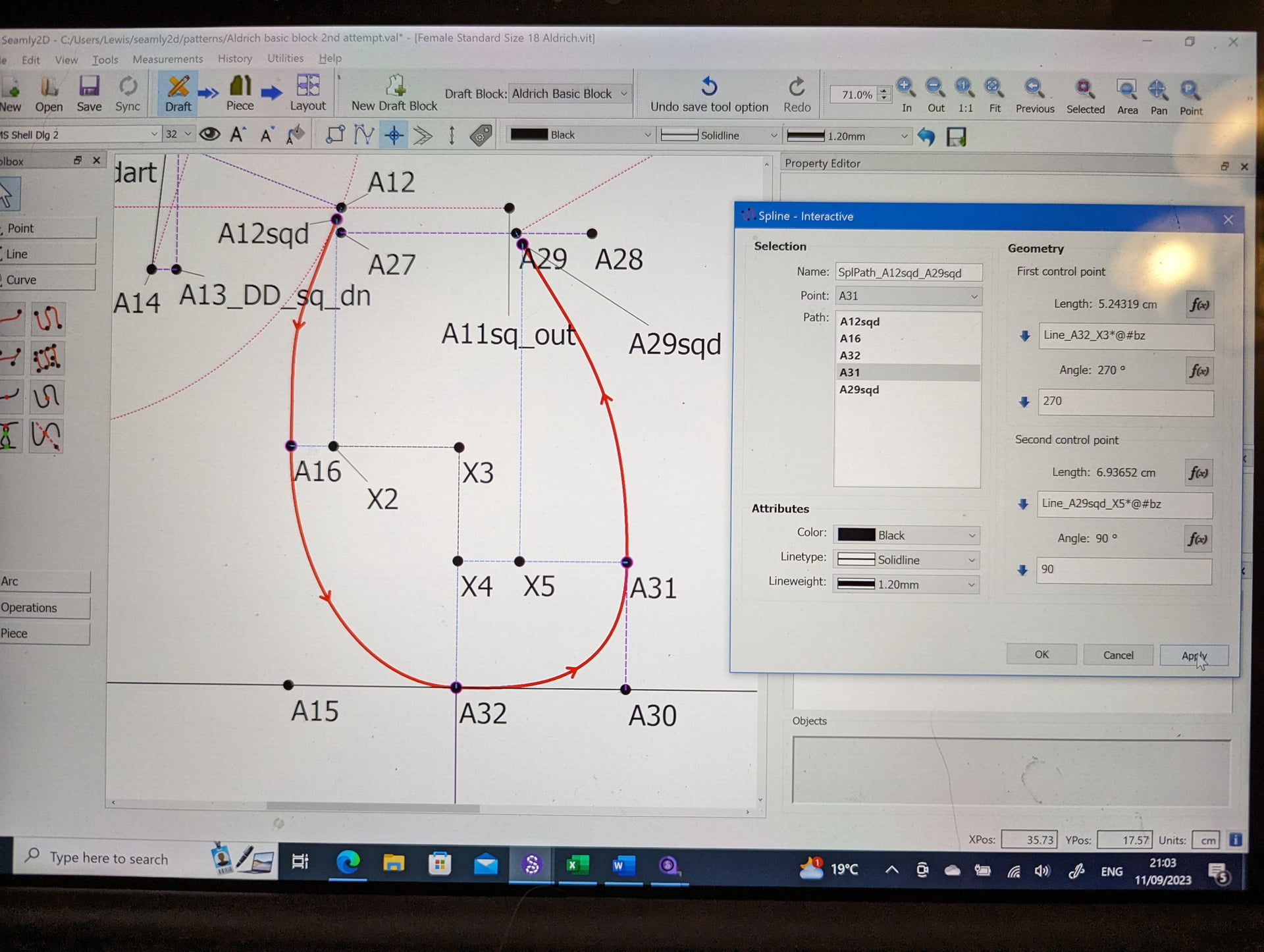 P.s. this may be in slight contravention of the Kolson method but I added a 0.5 cm right angle to the seam line at each edge of the curve, so they will really have a decent straight line when they meet sewn up, in the same way I’d add that when drafting on paper. I know my curve angles end at the correct angles but any errors in cutting would throw those out.