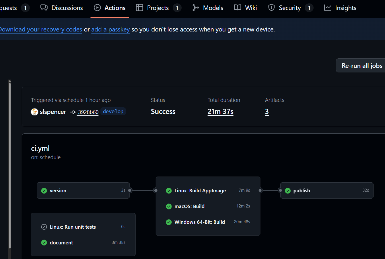 When the CI workflow is run at the specified time, it will build and run the tests, build the Linux, Mac, and Windows releases, and Publish an update of the Doxygen documents. Any of the Workflow actions are available through the Actions tab… you can then download an artifact build from a specific PR or for ex: the CI workflow.