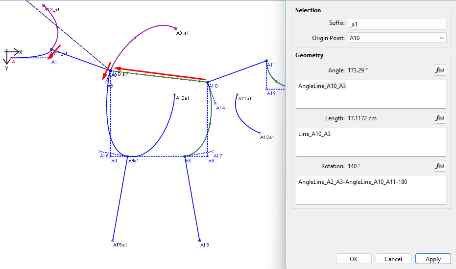 Next is to enter the rotation. In this case, you want to connect the 2 side seams to check if the armhole curve will continue from the one piece to the other smoothly. So the rotation is the angle of the line A8 to A15 minus the angle of the line A5 to A7: