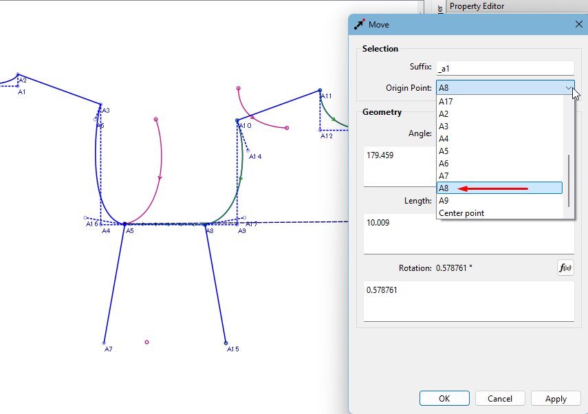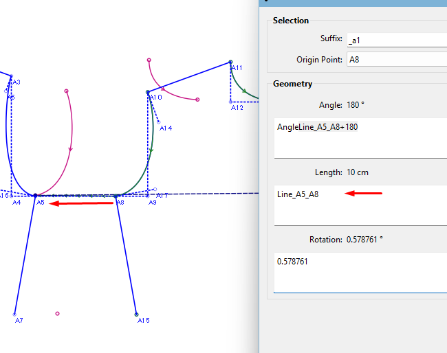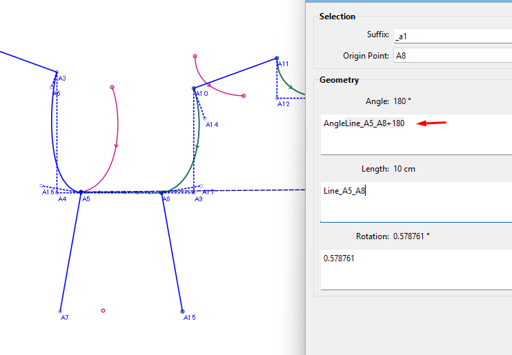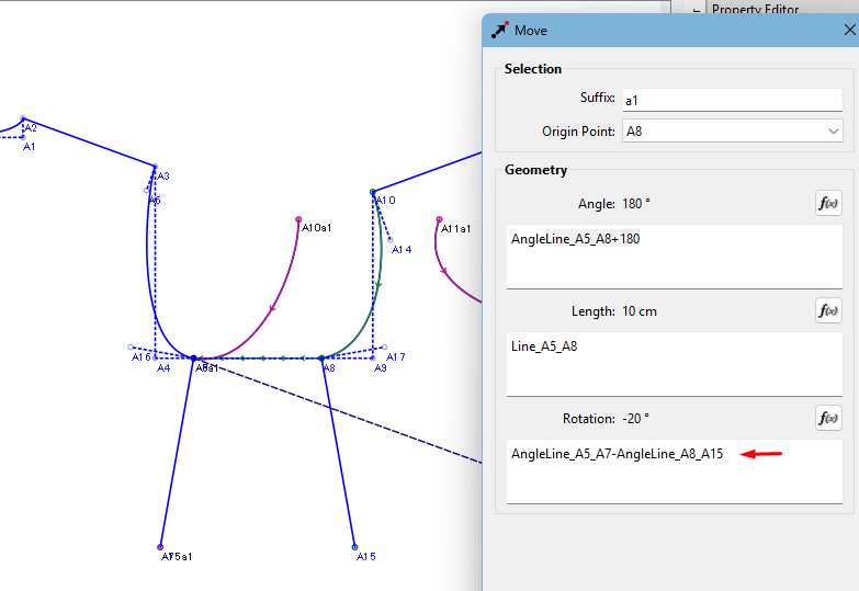 Next is to enter the rotation. In this case, you want to connect the 2 side seams to check if the armhole curve will continue from the one piece to the other smoothly. So the rotation is the angle of the line A8 to A15 minus the angle of the line A5 to A7: