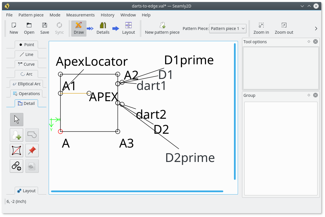 Meanwhile, here is a screenshot and the .val file with a simple square containing a dart and what I hope are descriptive variable names. If anyone is not familiar with the term D1prime or D2prime, I used those to indicate points which were exactly the same place as D1 and D2. I did this because I was selecting points in the following order for the workpiece: dart-extended-detail-points