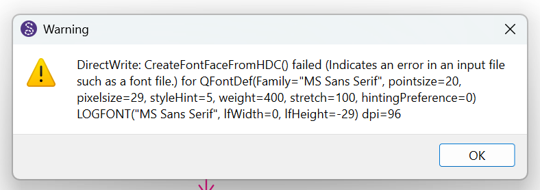 Because of this, and because the problem appears in multiple Seamly2D versions (even fresh installs), it seems that Seamly2D/Qt is trying to load the MS Sans Serif bitmap font during startup, and Qt’s DirectWrite backend cannot handle bitmap fonts. That would explain both the DirectWrite error and the QBackingStore error.