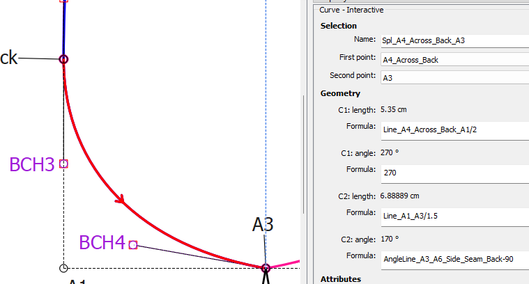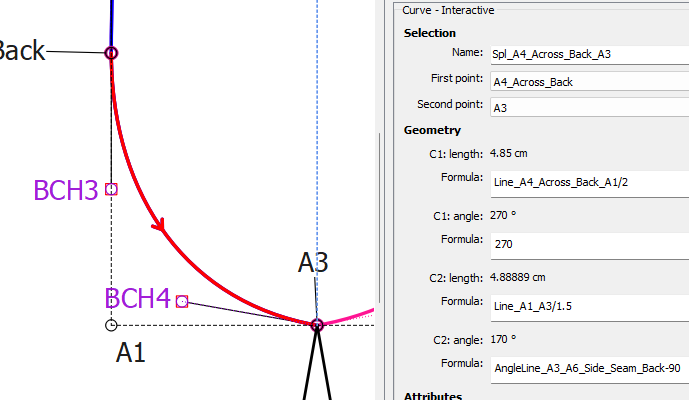 BHC4 - I have used the Point – on Perpendicular tool and clicked on the armpit point A3 and then on the back seam side point A6_Side_Seam_Back to create a point at 90° to the back side seam line. The formula entered for the length is Line_A1_A3/1.5 because I would like a slightly deeper circle portion. Change the Rotation to 180° to place the point correctly.