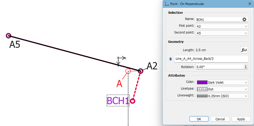 BHC1 - In my example, I have used the Point – on Perpendicular tool and click on the shoulder tip point A2 and then on the neck side point A5 to create a point at 90° to the back shoulder line. The formula entered for the length is Line_A_A4_Across_Back/3. No other setting needs to be adjusted.
