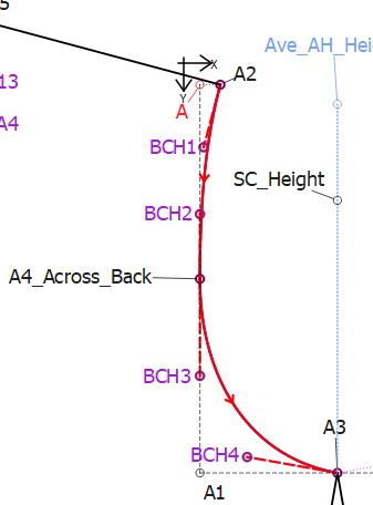 Back Curve = Pick up the Spline – Fixed tool and click on points A2, BCH1, BCH2, A4_Across_Back (section 1), BCH3, BCH4, A3 (section 2). Hit Enter.