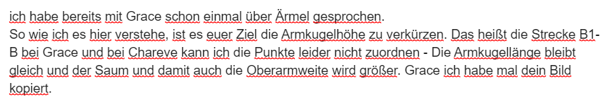 ich habe bereits mit Grace schon einmal über Ärmel gesprochen. So wie ich es hier verstehe, ist es euer Ziel die Armkugelhöhe zu verkürzen. Das heißt die Strecke B1-B bei Grace und bei Chareve kann ich die Punkte leider nicht zuordnen - Die Armkugellänge bleibt gleich und der Saum und damit auch die Oberarmweite wird größer. Grace ich habe mal dein Bild kopiert.