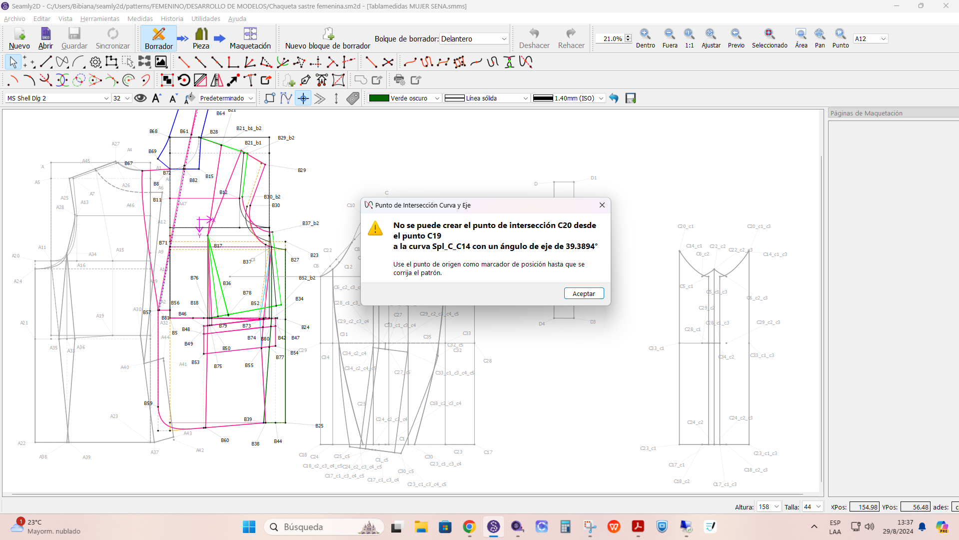 Tracé una chaqueta sastre para mujer y cuando abro de nuevo el trazo y cambio de talla o de tipo de medidas (multitalla o individuales), me salen varios mensajes de error y desconfigura la forma de la pieza de patrón en donde esté el “error”, y todos los mensajes tienen que ver al parecer, con puntos de intersección que hice en curvas desde un punto eje: