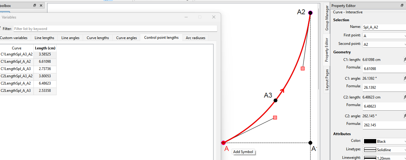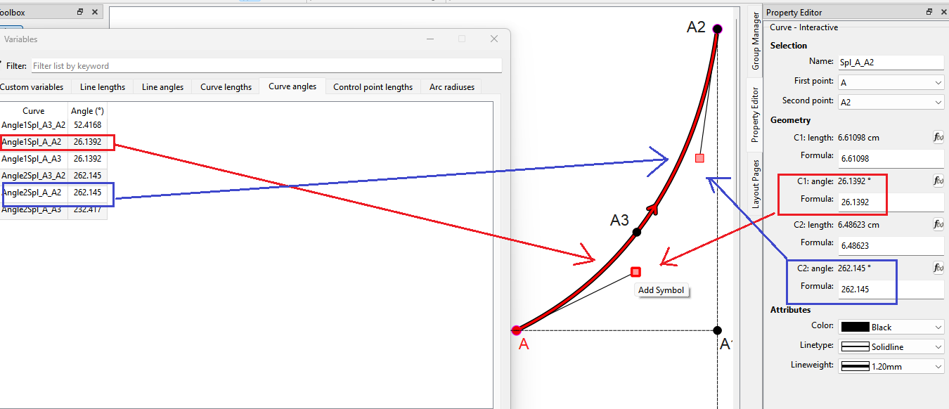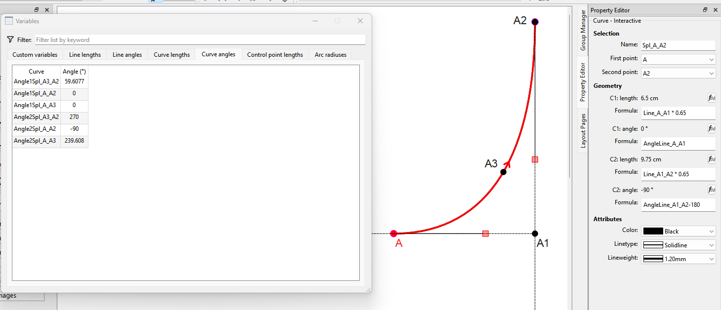 However… there is also an angle of the curve on either side of a Point on Curve which has no visible control points… which is why you will see here the angles for point A3… Angle1Spl_A3_A2 and Angle2Line_A_A3:
