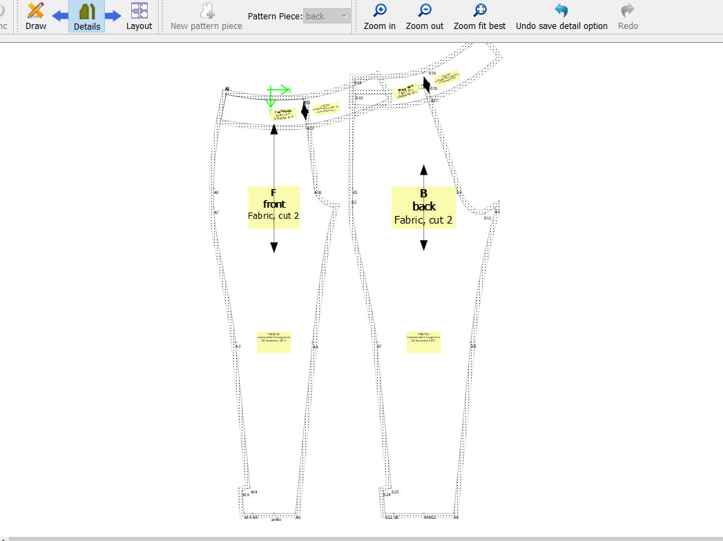 Once you’ve added the pin, goto Detail mode, then select the detail piece you want to work on… from there select options and you can then choose to add a grainline or labels using pins you’ve created.
