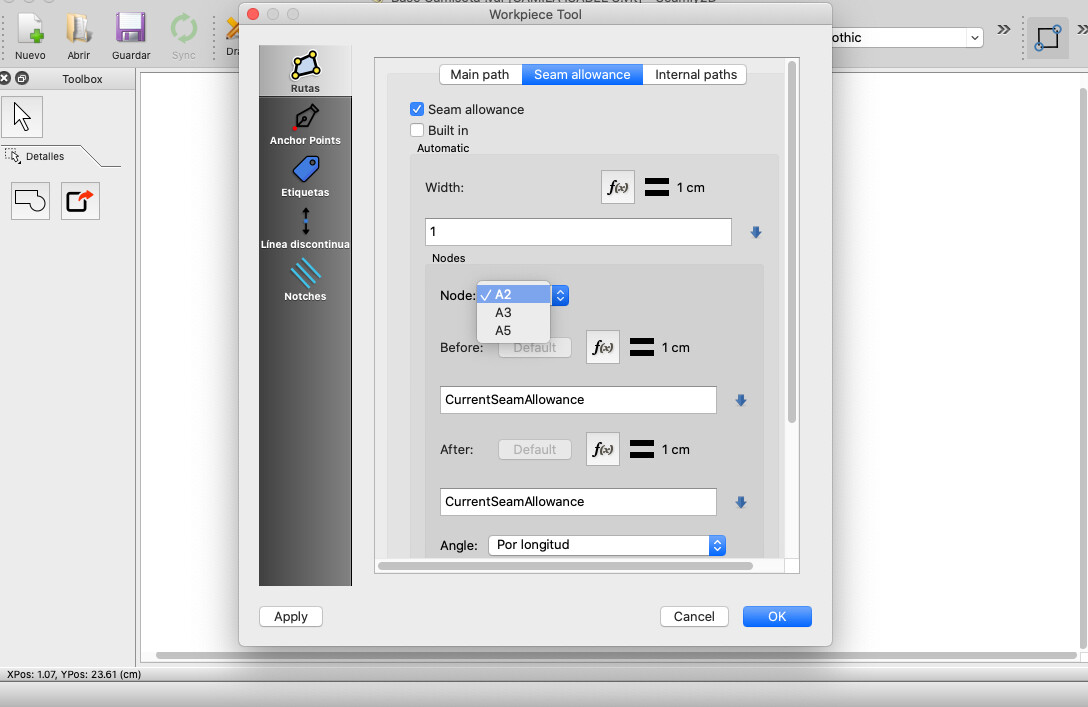 Aqui “nodos” significa solo los puntos. Selecto los puntos tambien cuando usa la hieramienta “Add New Pattern Piece”, o ahora puede usar la hieramienta “Insert Node”, pero esta poco mas difficil.