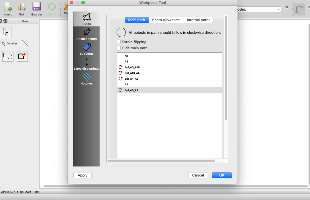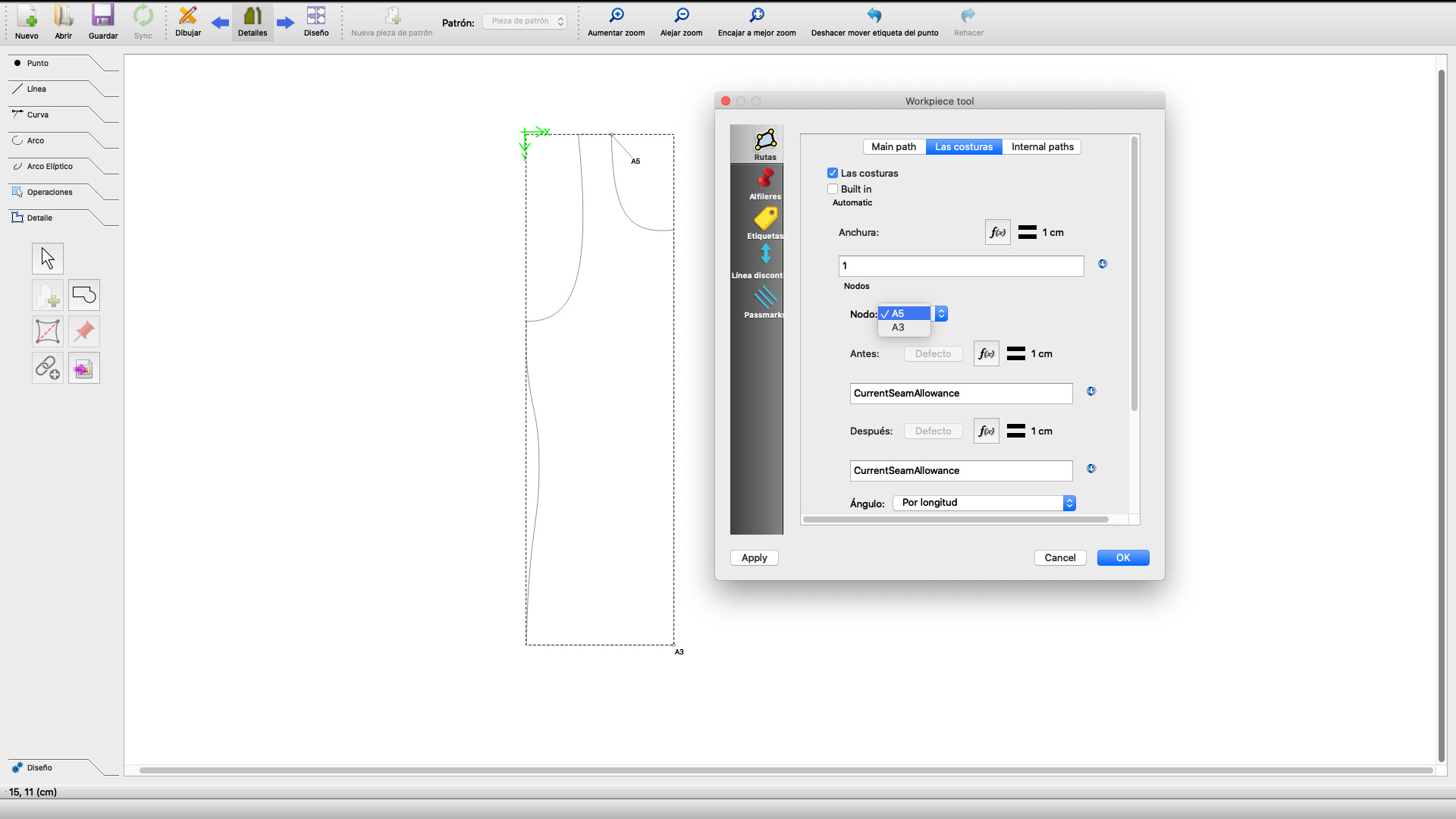 Aqui “nodos” significa solo los puntos. Selecto los puntos tambien cuando usa la hieramienta “Add New Pattern Piece”, o ahora puede usar la hieramienta “Insert Node”, pero esta poco mas difficil.