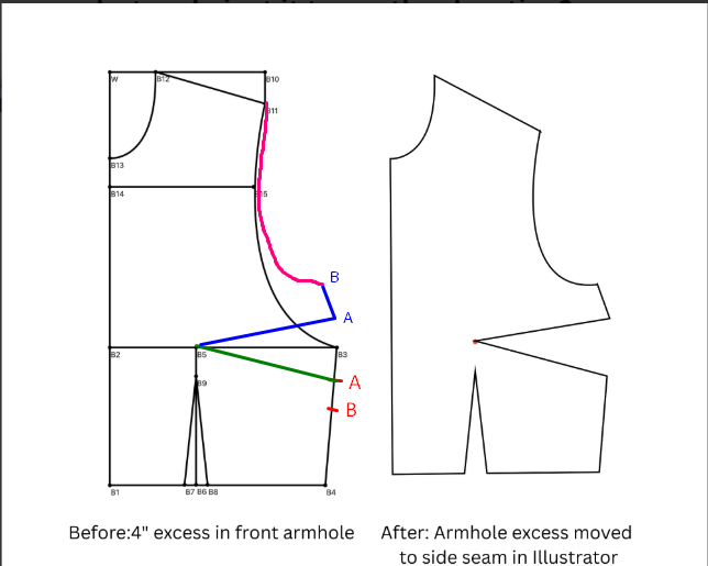Situation: My front bodice armhole is 2” too long after some adjustments.
