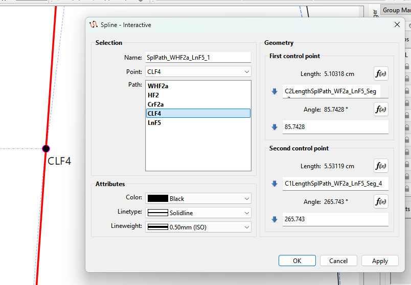 I removed the formula at CLF4 as it puts a kink in the seam. Again there’s no need for the other spline. Note: With splines… the control points at nodes are fixed at 180 degs apart. If you add a formula to one of the control points you’ve fixed the other point.. thus the kink above.