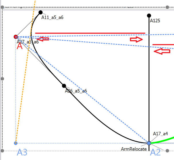 With A2, A5, and A8 representing your existing points I found point A6, and created the curve… the dotted orange line would represent the tangent that would intersect the curve at the right most point. From there one could draw an intersect with the Line_A125_A17_a4 to get the length.