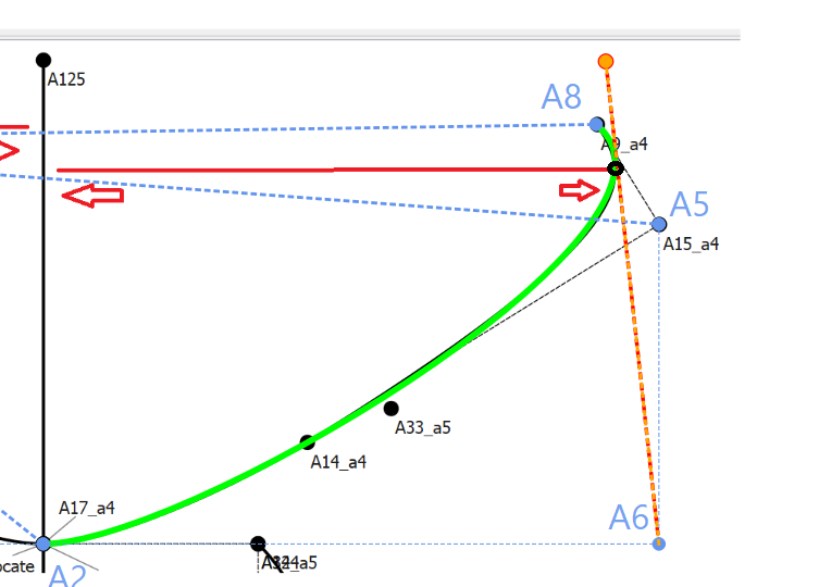 With A2, A5, and A8 representing your existing points I found point A6, and created the curve… the dotted orange line would represent the tangent that would intersect the curve at the right most point. From there one could draw an intersect with the Line_A125_A17_a4 to get the length.