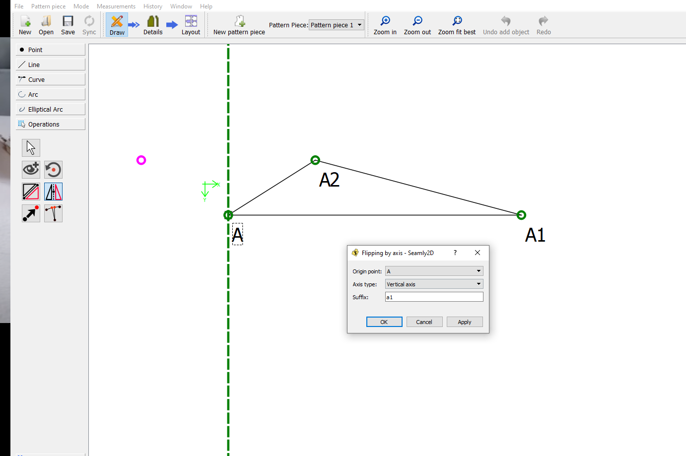 Here for example I use point A as the mirror. You will have to draw your lines by connecting the points afterwards. Then just make a detail of the front and back of your pj pants.
