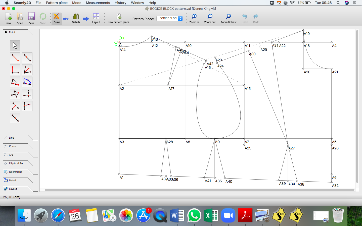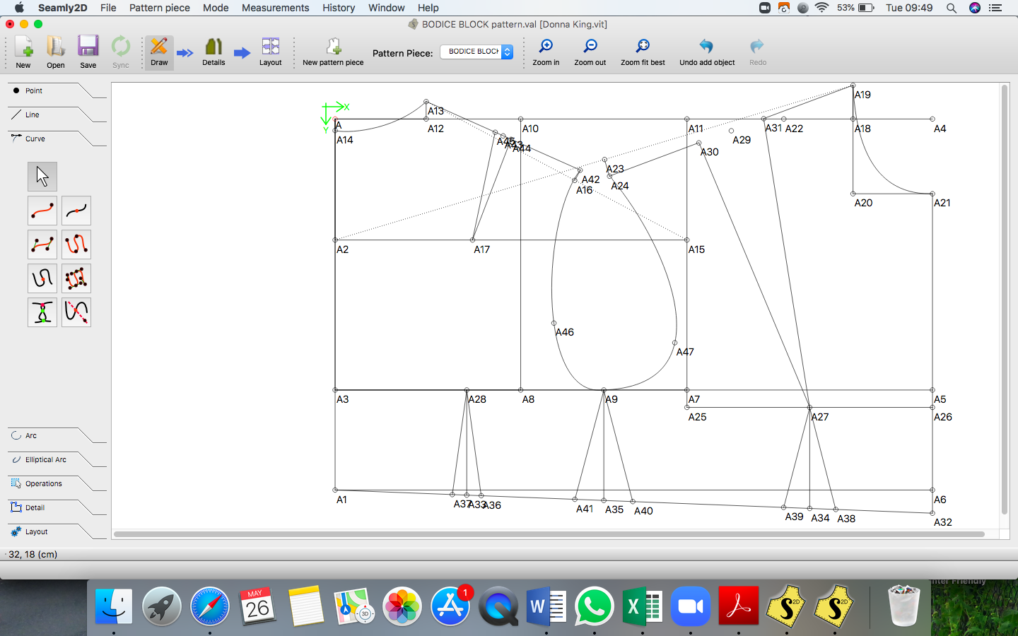 Within the main path it now reads spline, point, spline and the armhole shape is now correct and I have a passmark on the armhole.