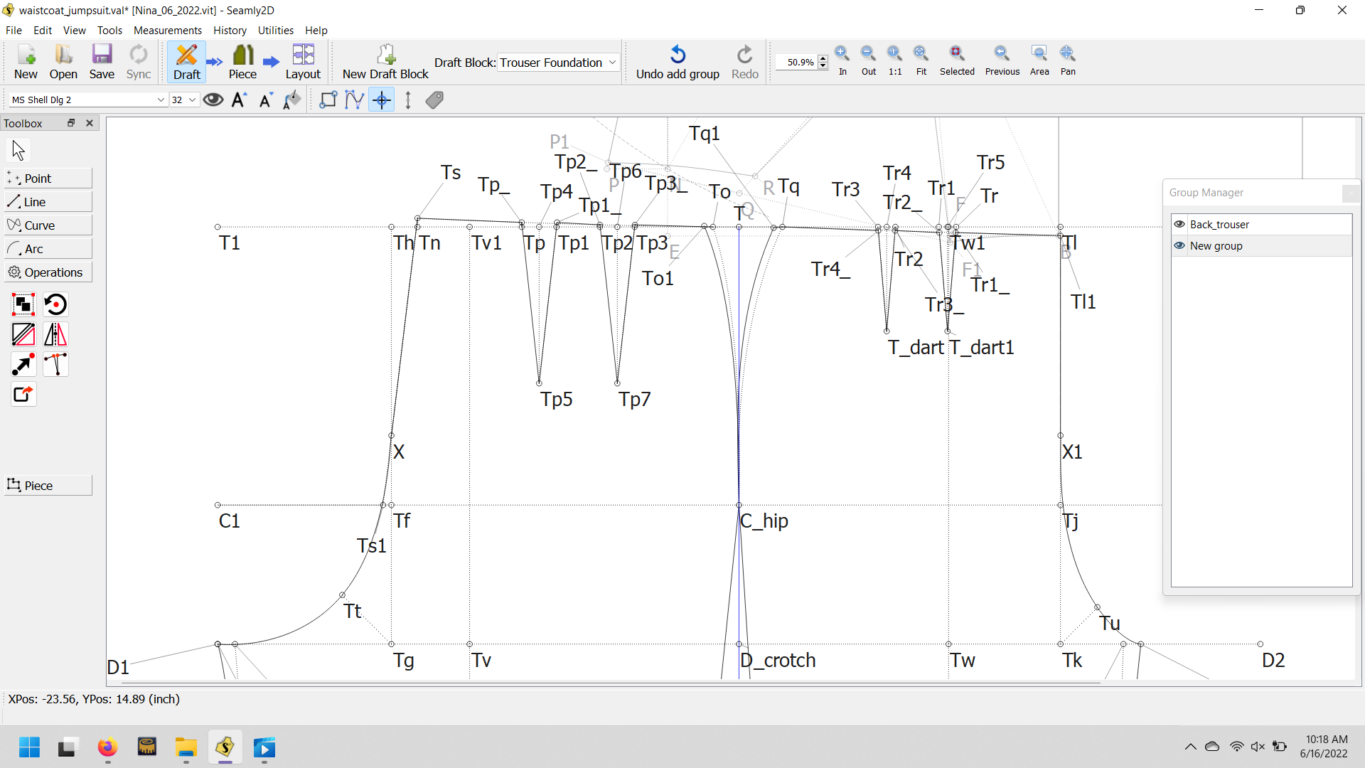 I have been making great progress with the software and am attempting to draft my first pattern, a waistcoat jumpsuit. I have drafted the basic front/back bodices and trouser blocks in the same pattern file, and am ready to work on top of the blocks.