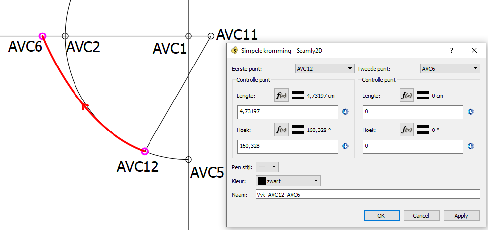 AVC1a-AVC12: deze lijn moet lijn AVC3-AVC5 raken maar dan onder het punt AVC1. Hier is de lengte niet erg van belang. Het begin en het eind van deze kromming moet als het ware een verlenging zijn van hulplijnen