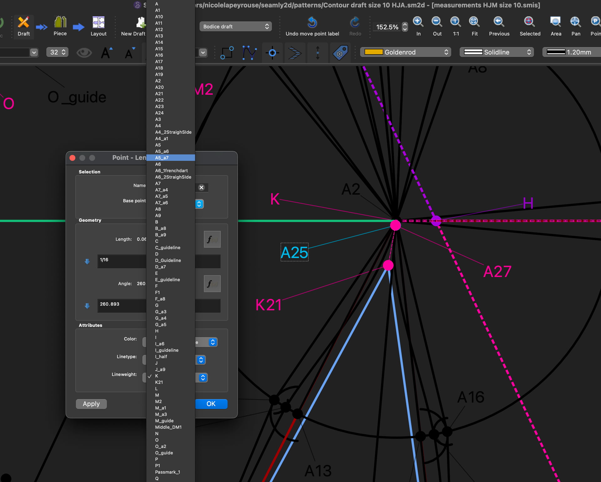I have been playing around in seamly and drafting some basic blocks and ran into a slight issue. I made a base point labeled a25 and made a path off of this point. I then shortly later realized I needed to start that path on a point that was 1/16 down from a25. I am trying to move the base point in the properties setting but it seems that any point I made after a25 for this point is not being displayed. How do I add a27 to the base point list?