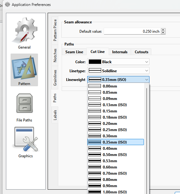 You can set the pref for cut lines in Pattern->Paths->Cut line: