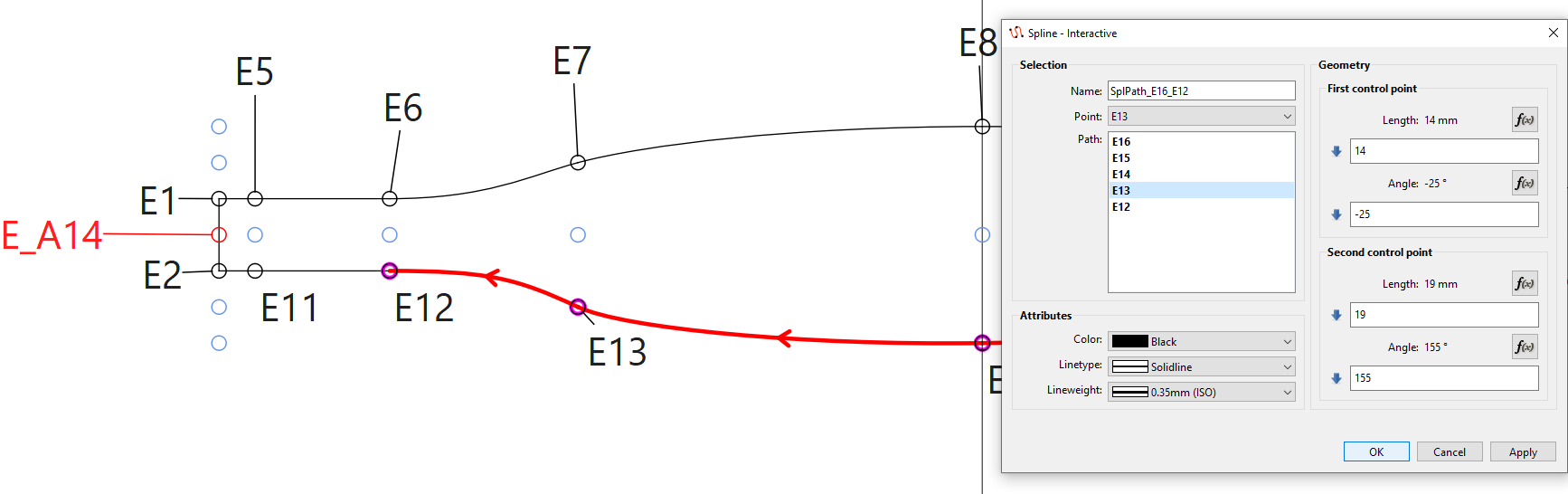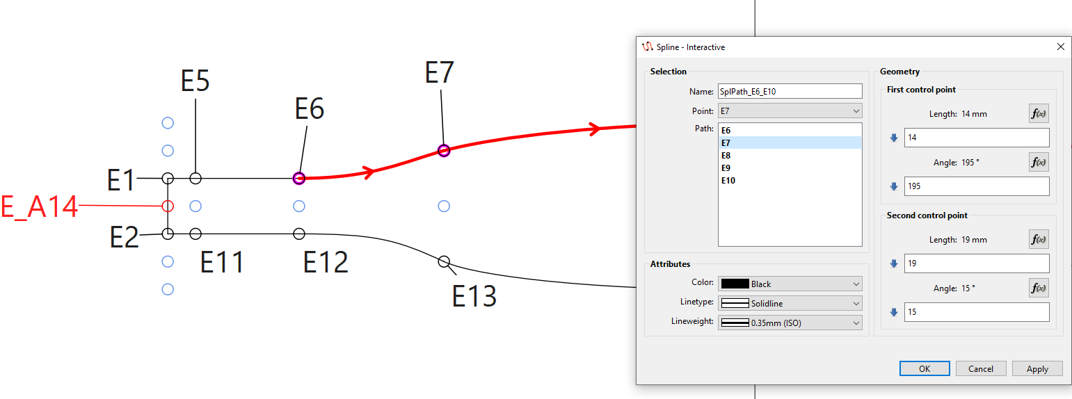 I have a ‘Piece’ drawn using interactive splines, whereby the top (E6 → E10) and bottom (E11 →