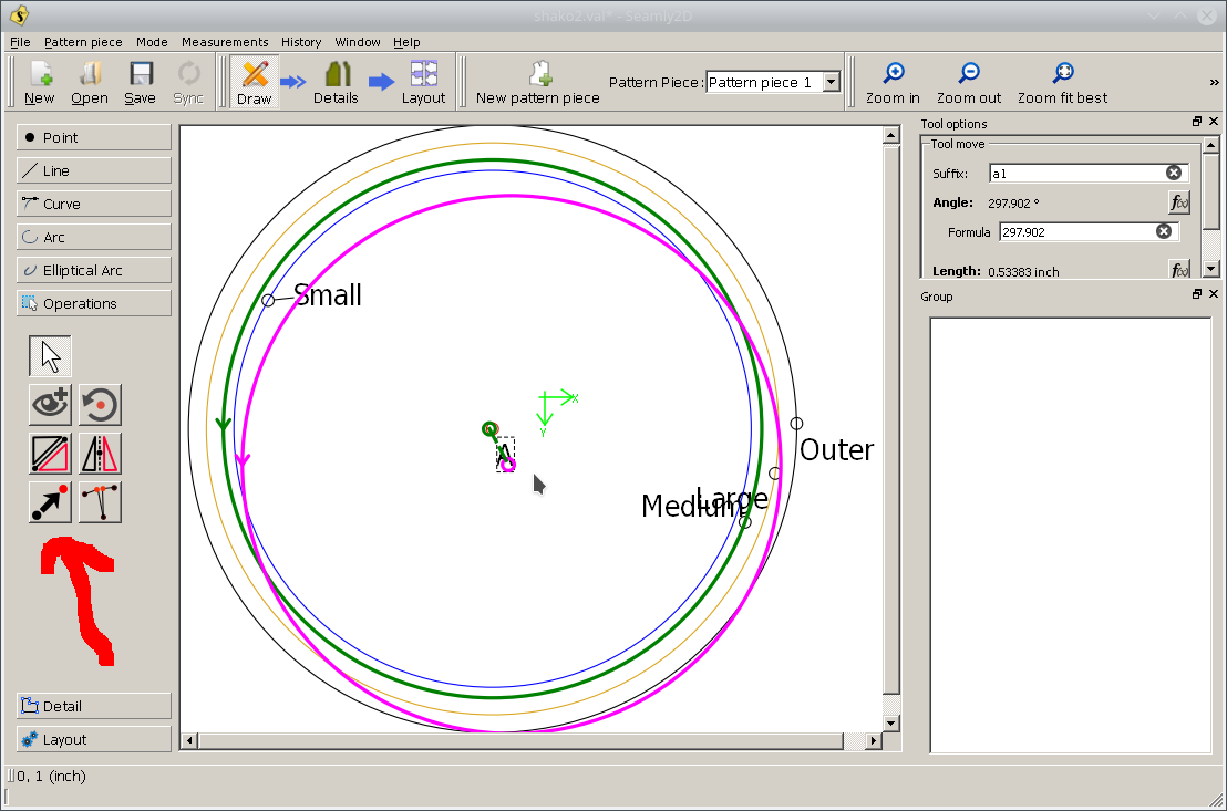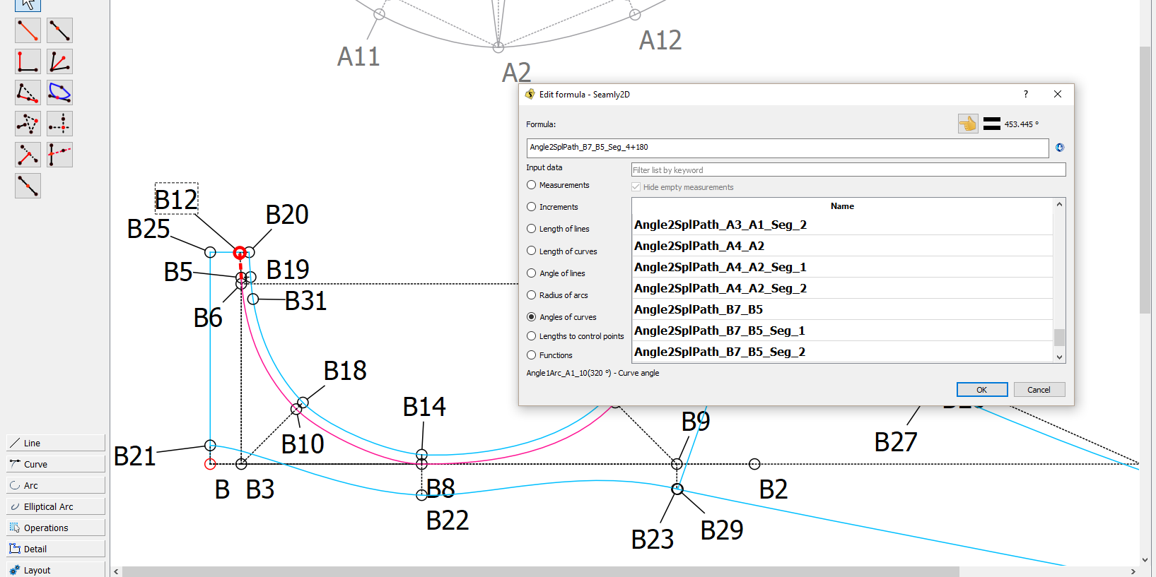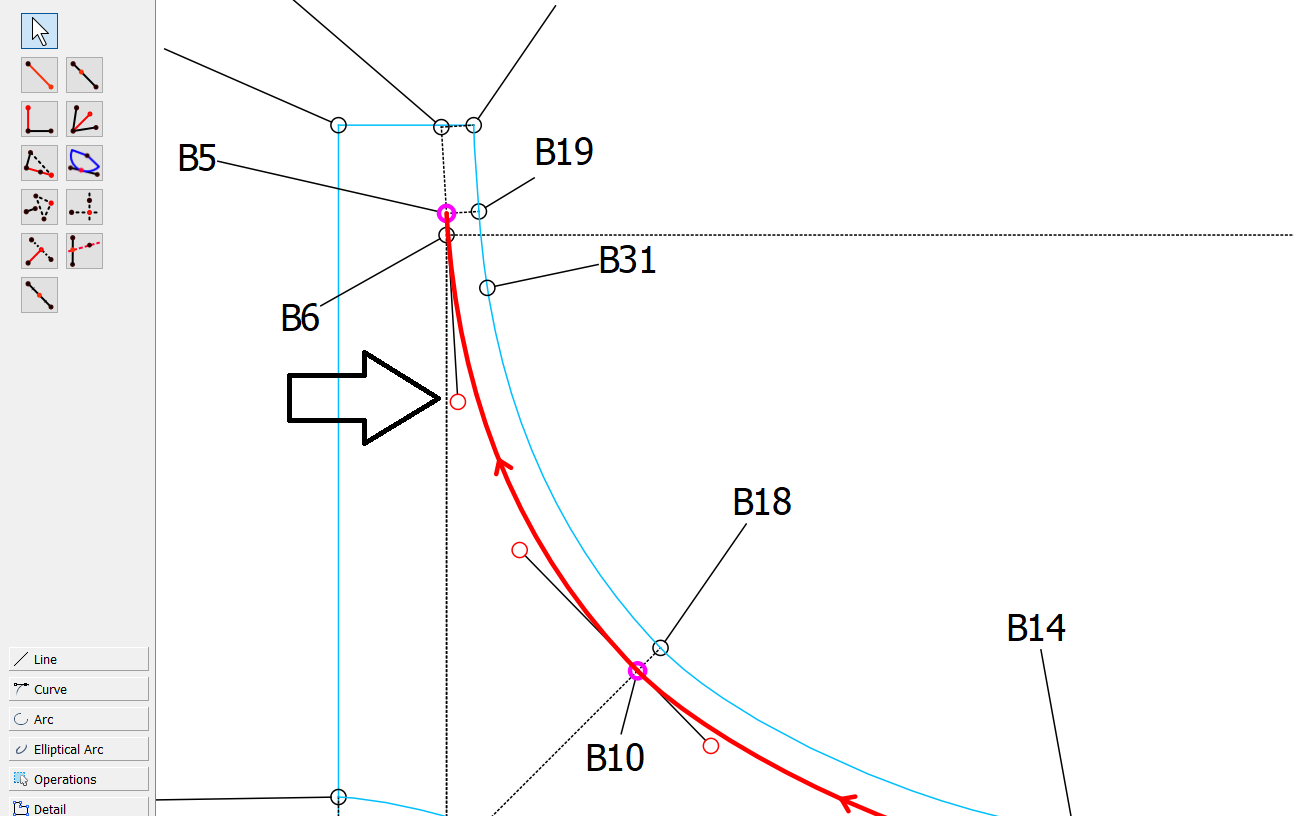 - At some point KS draws a parallel curve to the wire line, as if you were to draw a seam. Trying to move this curve will not get the same result as some parts need to be moved left and others up, going inward, making the curve smaller. So I made a second curve to get the result I needed.