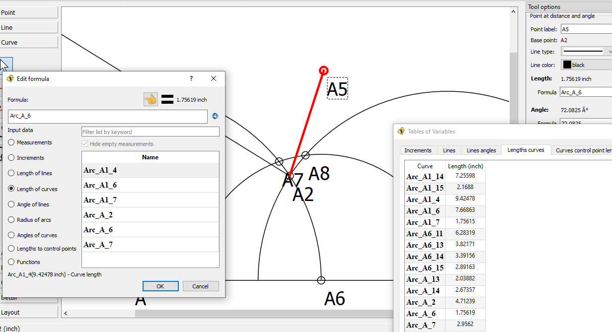 In this case by moving the arcs away the intersection point A2 is no longer an intersection point and the origin is used as the place holder so the pattern doesn’t crash. Since the arcs no longer intersect there are no arc segment lengths in the variables table->curve lengths.