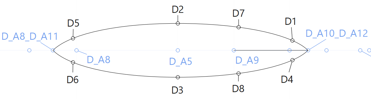 I set the notches ‘D2’ & ‘D3’ at 90° to the axis from ‘D_A5’ and the other 4 (‘D5’, ‘D7’, ‘D1’ & ‘D6’, ‘D8’, ‘D4’) using the points spacing along the axis and setting the lengths relative to the nearest ‘end point’ (‘D_A8_D_A11’ & ‘D_A10_D_A12‘) of the axis.