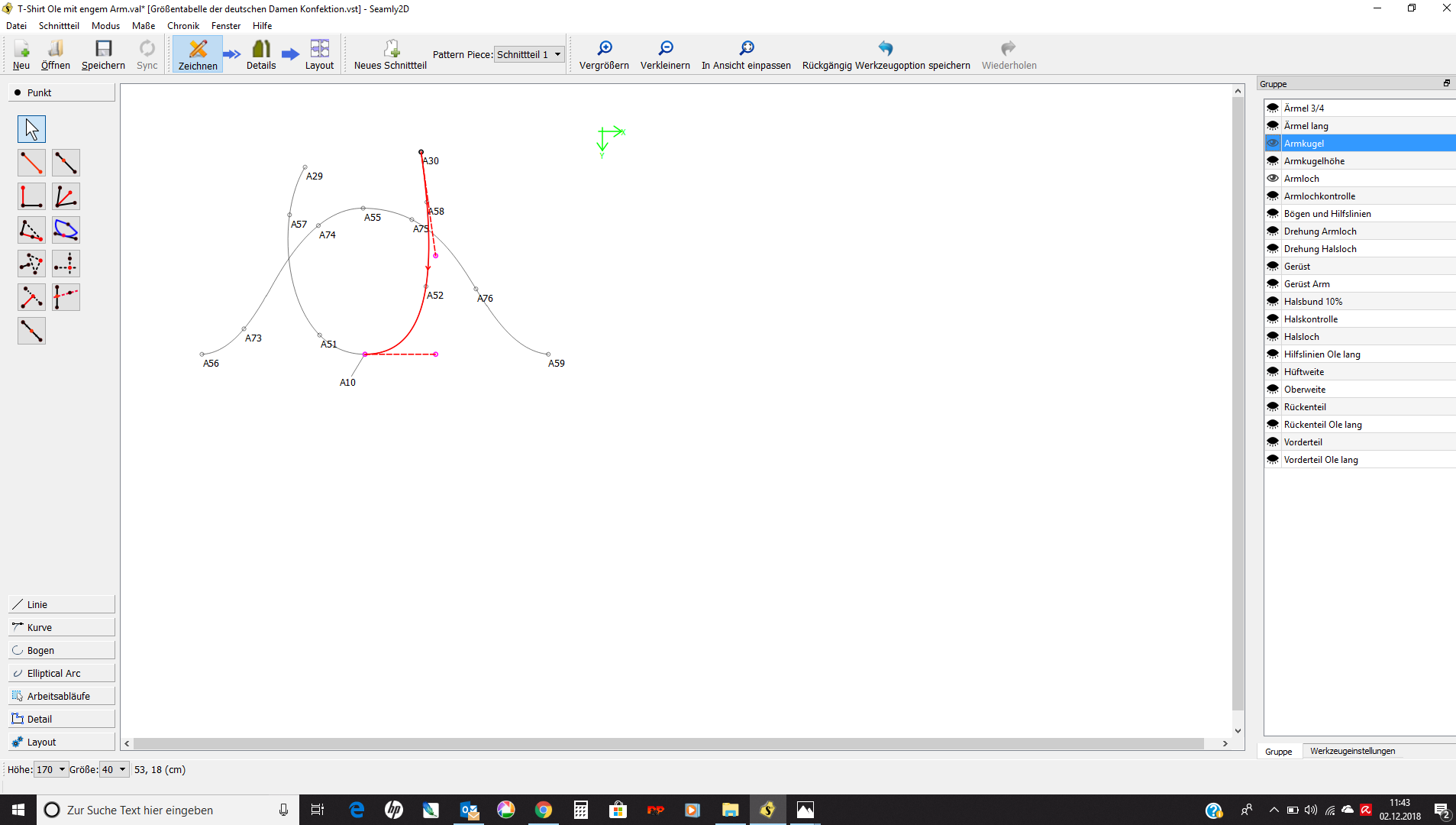 Ich arbeite im Rückenteil mit einer kubischen Bezierkurve und im Vorderteil mit einer einfachen Kurve und komme damit gut klar. Habe ich nur mit einer einfachen Kurve gearbeitet kam ich beim Gradieren nicht mehr hin. Beim zeichnen der Armkugel öffne ich immer das Armloch - ich habe es in einer einzelnen Gruppe angelegt - damit ich die Kurven gut vergleichen kann. Als Hilfe habe ich immer noch die Gruppe: Armlochkontrolle angelegt. Leider kann man die Kubische Bezierkurve nicht verändern. Vielleicht müsste man dort mit den Punkten arbeiten. Ich stelle meine Schnitte nach Müller und Sohn auf. Da bin ich noch am ausprobieren:)
