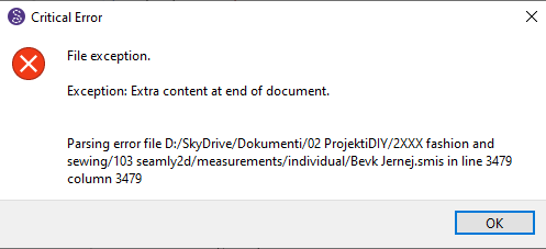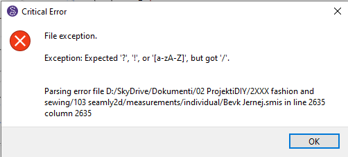 It’s improbable that one would ever have a measurement file with 2635+ lines… in fact that file only has 94 lines with the one in question at line 86. So I have no idea what is happening. And the File Exception error provides little clue as the exception was thrown within a Qt routine, and not Seamly.