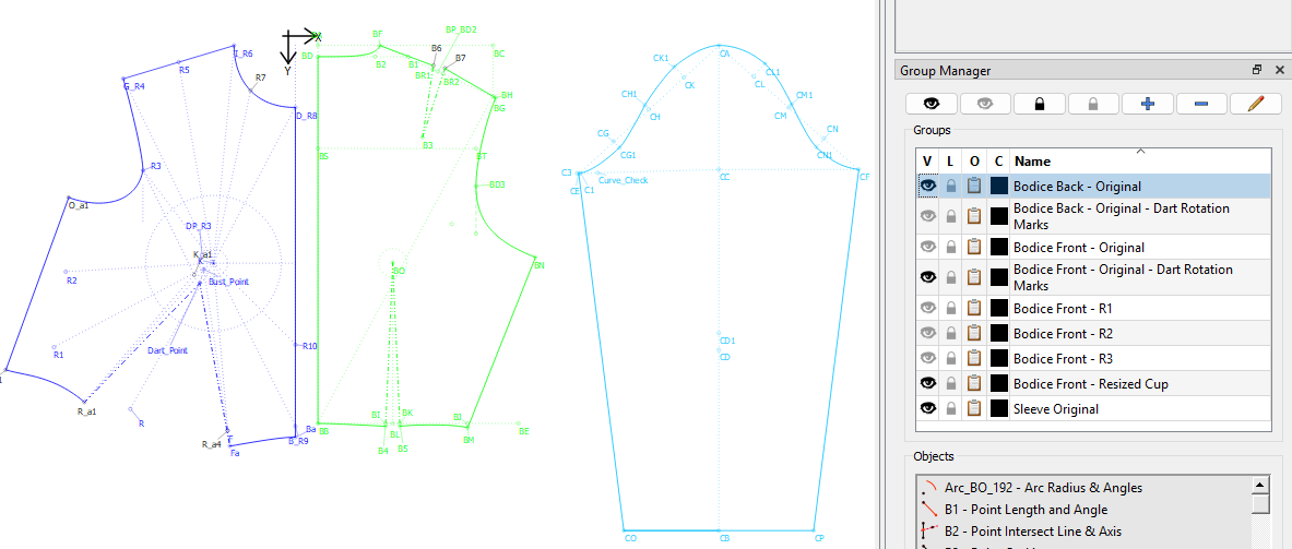 What I do is, I put the basic draft into a group. Then I make changes to the design by adding points to the existing draft and rotating parts around to change the position of the darts, etc. etc. Here is an image of my HJA basic sloper with the bust adjustment:
