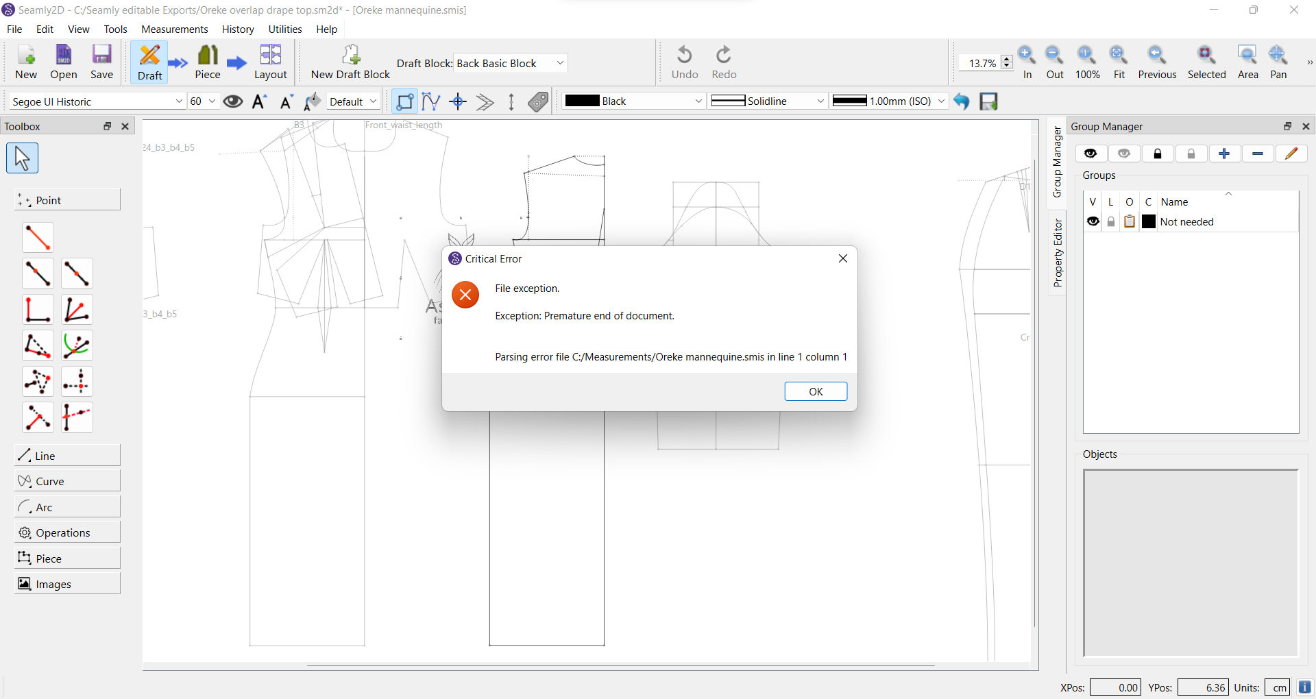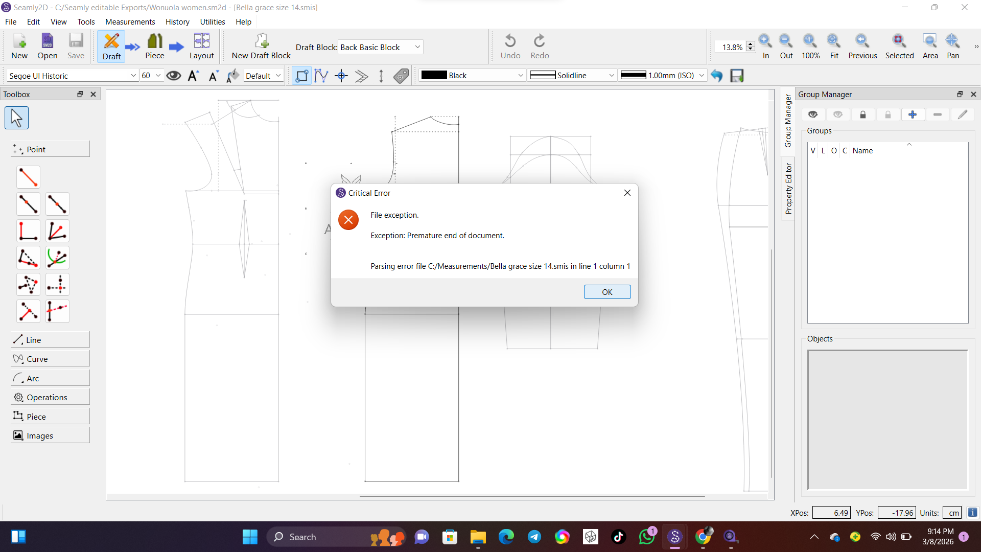 After this error msg, i tried opening another multisize pattern but it does not open, rather it brings out this same error message, is there anything i’m doing wrong?I would need to see the pattern and mesasurment files to see what’s wrong with them.