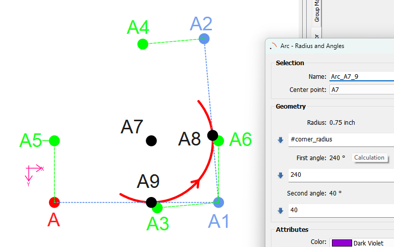 The reason I did this is pockets are not always square… and I now know to make a corner tool where you would select the 2 sides (3 points A2, A1, and A)… and a radius for the curve. The tool would create the curve and 2 endpoints. If you wanted to change the size of the curve just change the radius. As it is right now I’d have to change 5 tools. Unless of course if I created a radius variable. :slightly_smiling_face: