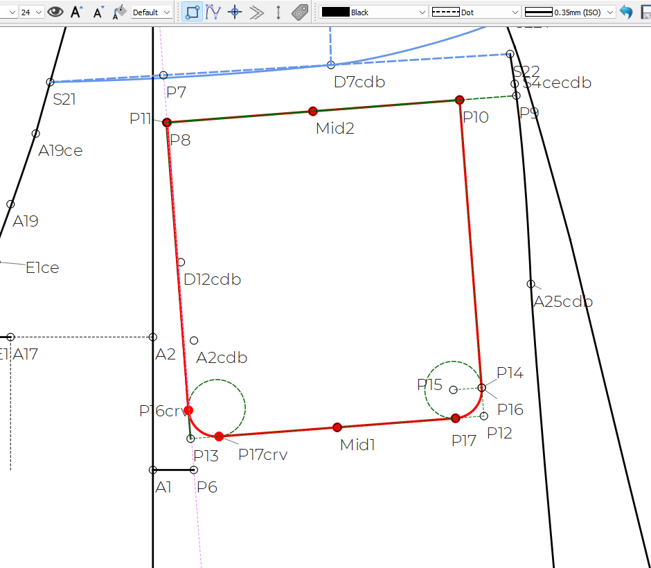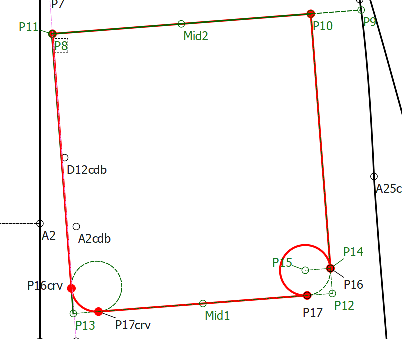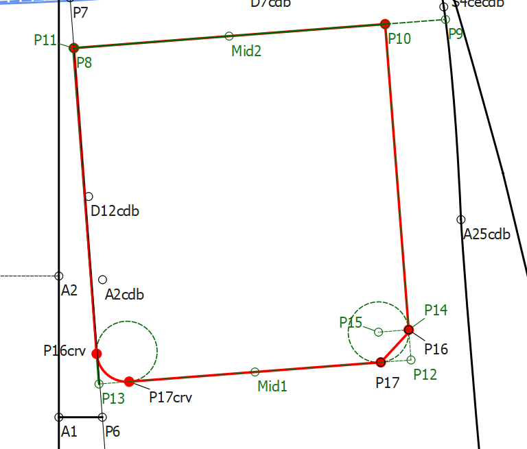 BTW… this is why the pattern was not working as is with the arc angles at 0 & 360. The horizontal dashed pink line is the 0-360 start & end points…as you can see they are no where near point P14 or P16 so there’s a gap between the P14 (or P16) and the start of the Arc. The other side works because Point A17crv and point A16crv are on the Arc between the start end end point.